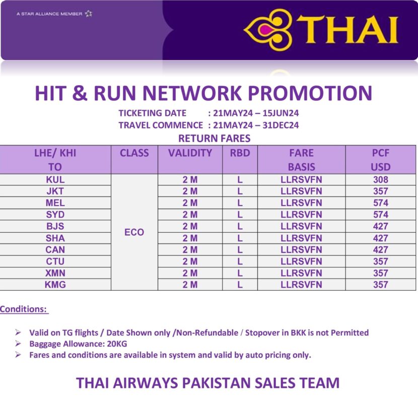 24 May AVIATION NEWS Thai Airways Announce Hit and Run Network Promotion June 6, 2024 By alhamdan.holiday 0 comments Thai Airways Announce Hit and Run Network Promotion for Pakistan to these sectors,LHE / KHI toKUL, JK... Continue reading